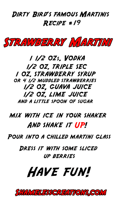 Strawberry ‘tinis for-evah. Dirty Bird is sometimes known as the Fifth Beatle. He’s known as that in his own bleary head while he’s out in the strawberry patch, gathering berries for his fabulous summer treat after he’s already had a few of his own concoctions. Two of these tart and sweet red thangs will put some sunshine in your song.